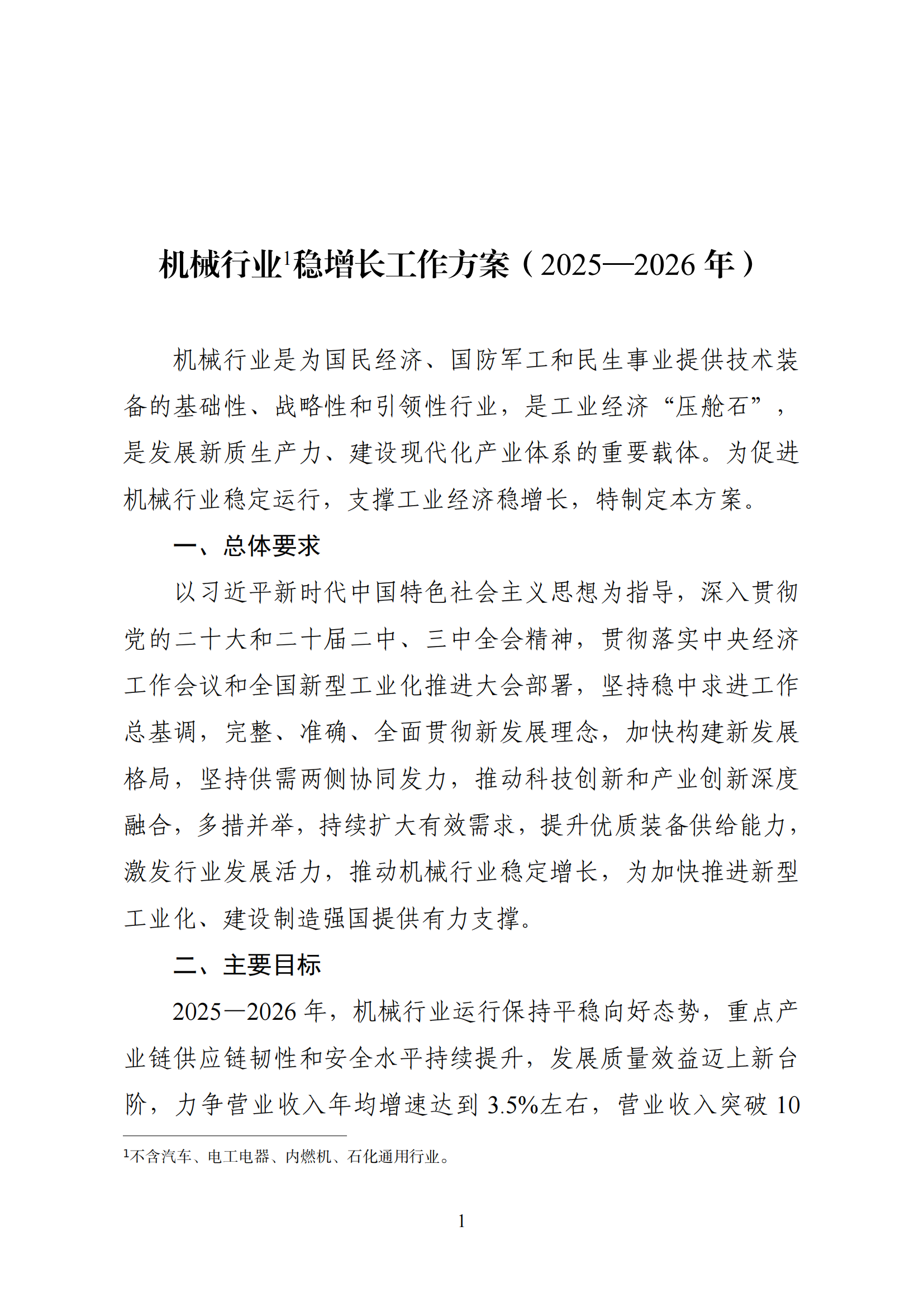 工业和信息化部等六部门关于印发《机械行业稳增长工作方案(2025—2026年)》的通知